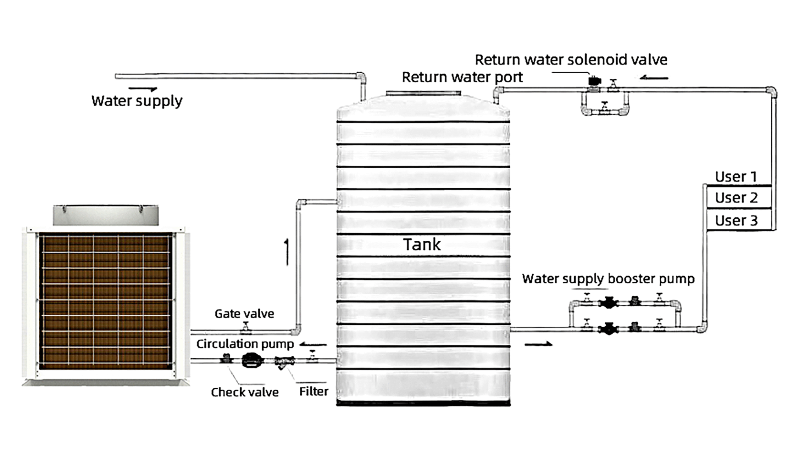 CIKOTON air source heat pumps can supply domestic/commercial hot water and/or house heating. With 3-way valve, the heat pump controller can change the circulating direction of water between hot water tank and house heating system, and set hot water as priority.